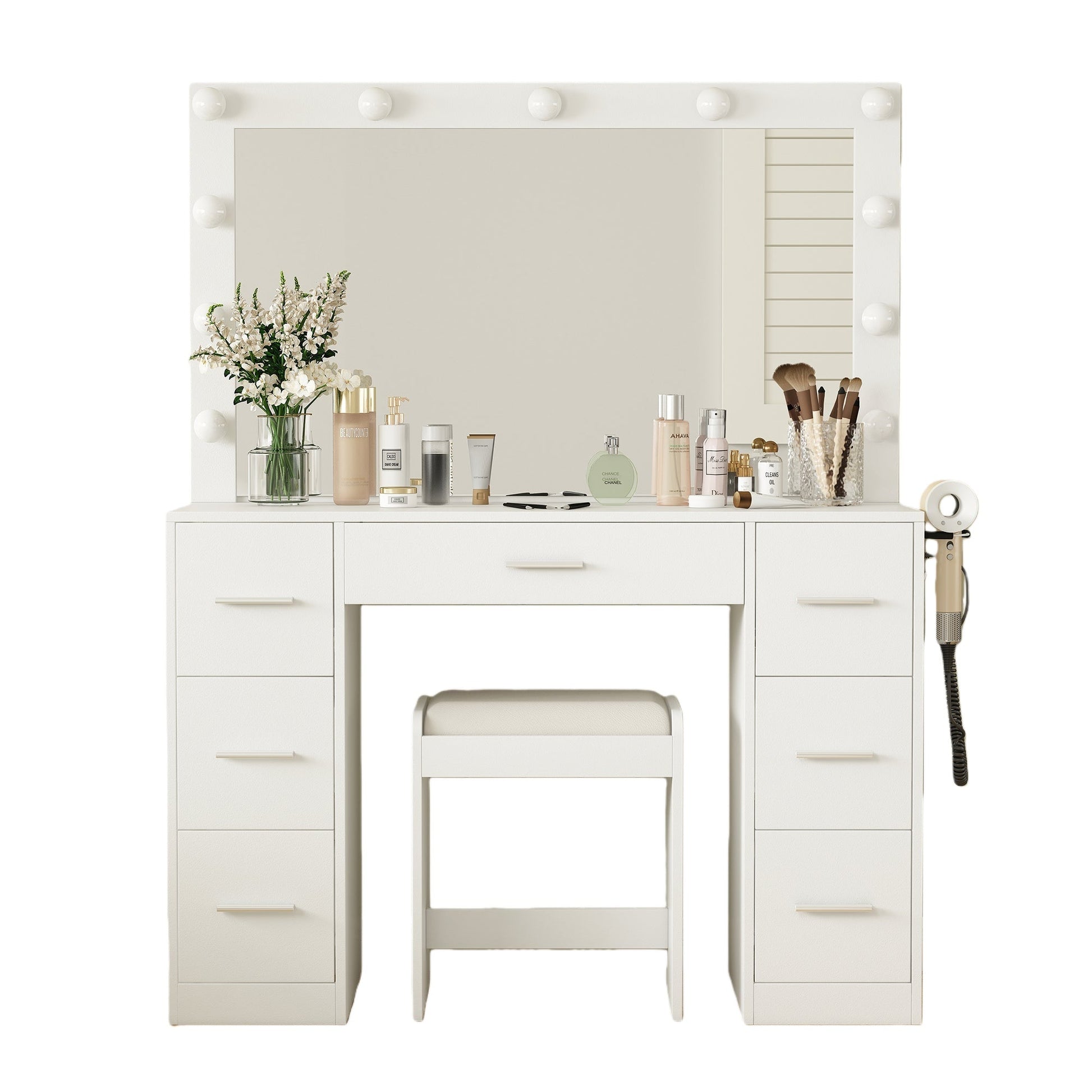 - Built-in Power Outlet: The vanity comes with a hair dryer stand with a built-in power outlet. The built-in charging station includes 2 standard plug sockets and 2 USB ports to connect your hair dryer, curling iron, computer, cell phone, ipad and other devices, so that all activities can be carried out on this vanity table.
